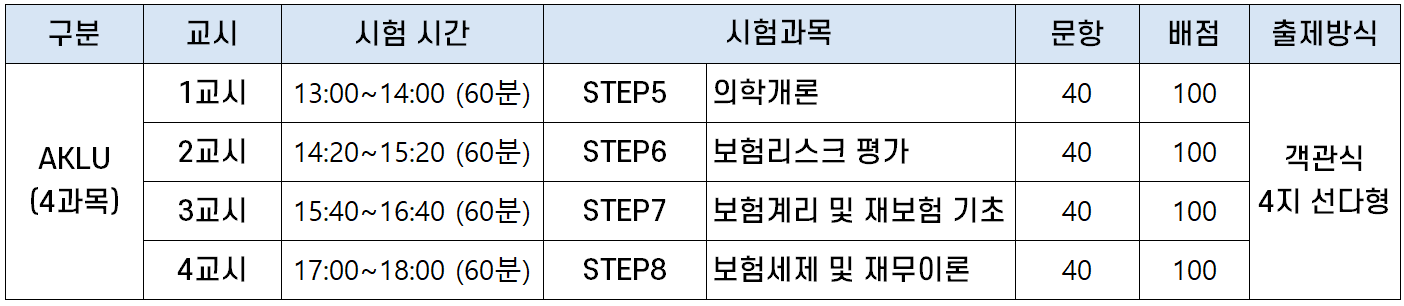 언더라이터 자격증 2단계인 AKLU 시험은 ① 의학개론, ② 보험리스크 평가, ③ 보험계리 및 재보험 기초, ④ 보험세제 및 재무이론의 4개 과목으로 구성됩니다.