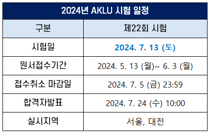 AKLU 시험은 매년 1회 시행되는데요. 2024년 시험 일정은 다음과 같습니다.