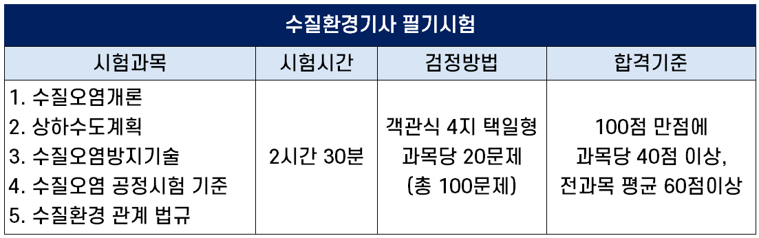 수질환경기사 필기시험과목은 ① 수질오염개론, ② 상하수도계획, ③ 수질오염방지기술, ④ 수질오염 공정시험 기준, ⑤ 수질환경 관계 법규(물환경보전법, 환경정책기본법, 하수도법, 가축분뇨의 관리 및 이용에 관한 법률 등 수질환경과 관련된 기타 법규)의 5과목으로 구성됩니다. 과목별 세부 출제기준은 하단에 첨부한 수질환경기사 출제기준 파일을 보시기 바랍니다.