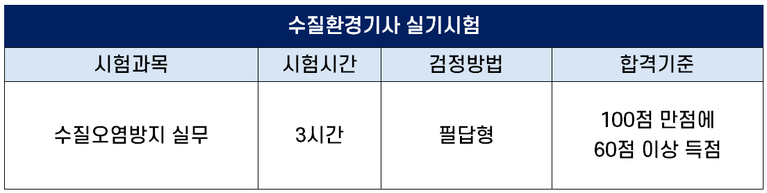 실기시험 과목은 수질오염방지 실무로 필답형으로 출제되는데요. 시험시간은 3시간이며, 100점 만점에 60점 이상 득점하면 합격입니다.