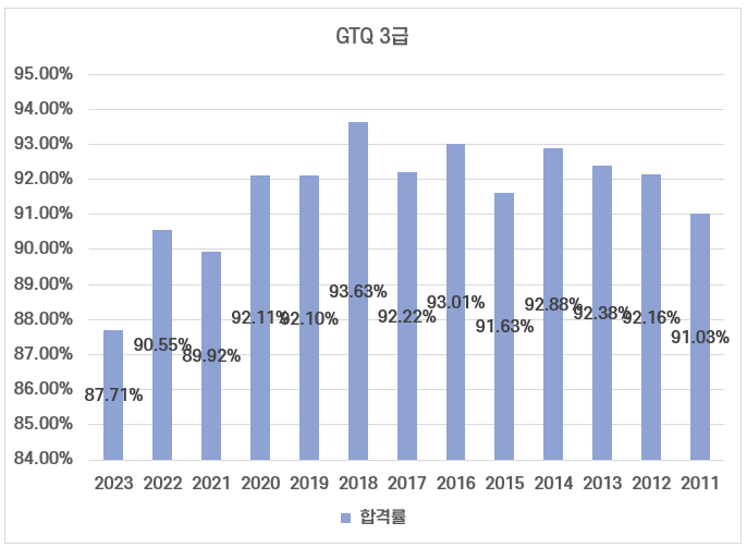 GTQ 3급은 가장 난이도가 낮은 등급이다보니 평균 합격률도 약 92%로 매우 높습니다.