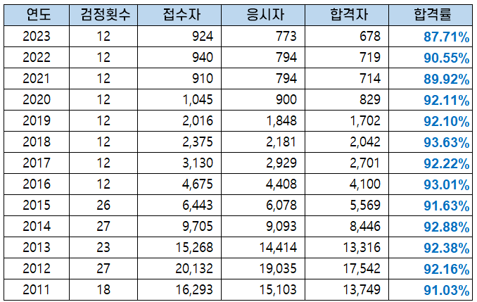 | 연도 | 응시자 | 합격자 | 합격률 |