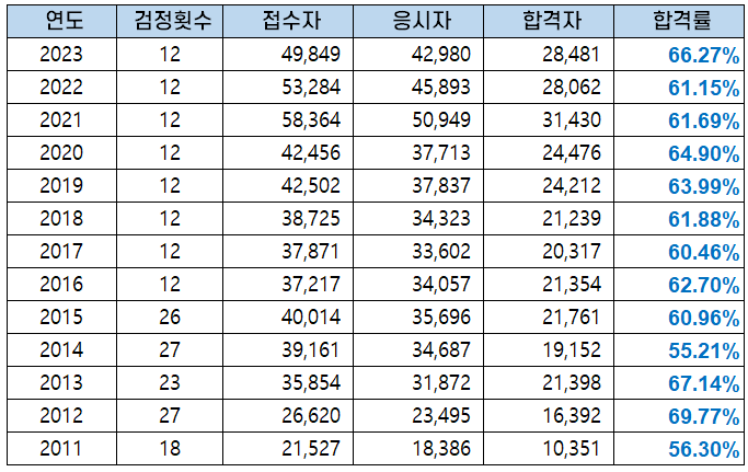2022년에는 2021년보다 응시인원이 조금 감소했지만 합격률은 비슷한 수준인 61.15%를 기록했고, 2023년 합격률은 66.27%를 나타냈습니다.