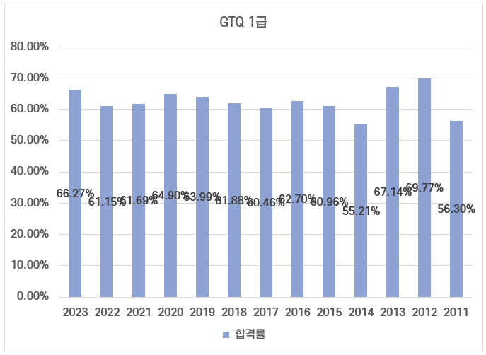 GTQ 1급 평균 합격률은 62.54%정도인데요. 2011년에만 56.3%의 합격률을 기록했을 뿐 연도별 큰 편차없이 꾸준히 60%대의 합격률을 유지하고 습니다.