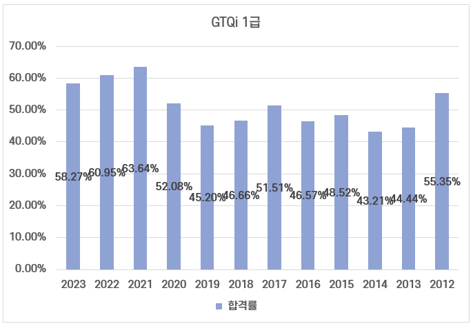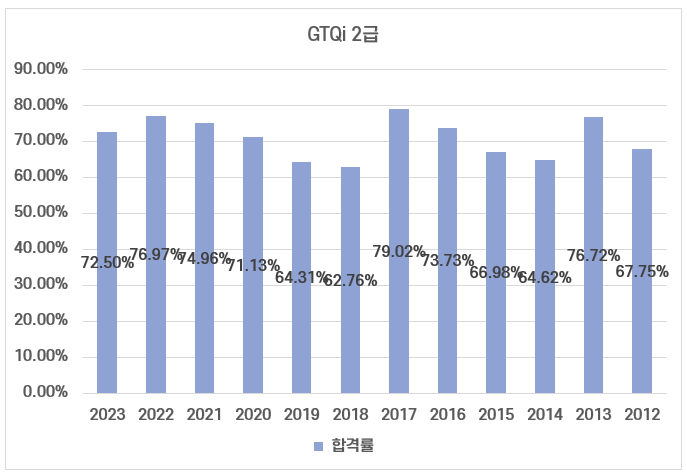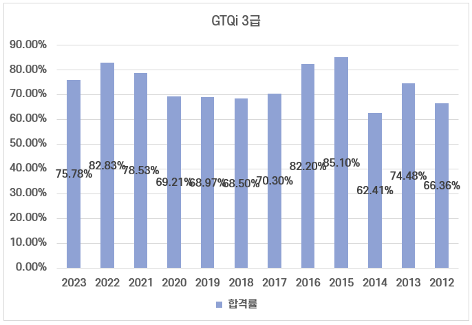 GTQi 3급은 가장 난이도가 낮은 등급이다보니 평균 합격률도 약 74%로 높은 편입니다.