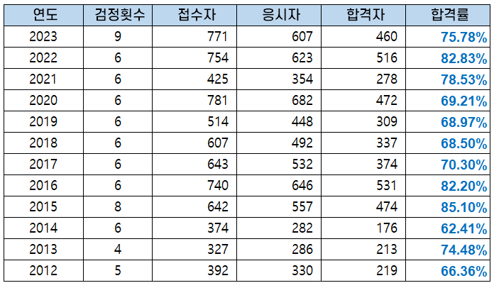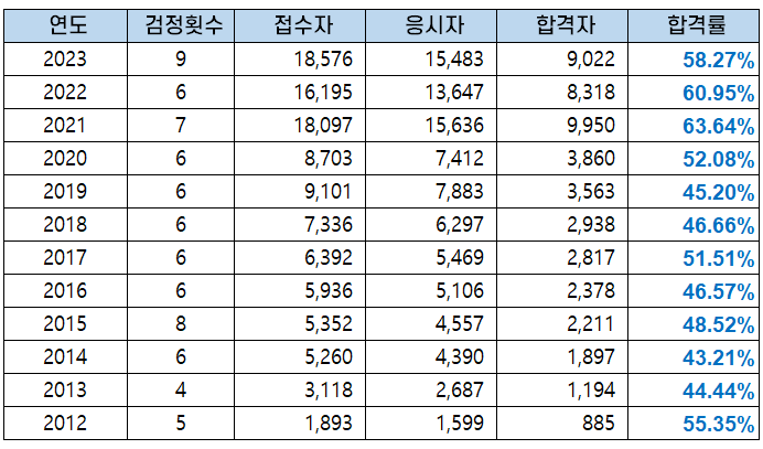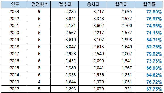 | 연도 | 응시자 | 합격자 | 합격률 |
