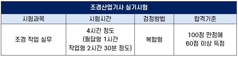 실기시험 과목은 조경 작업 실무로 필답형과 작업형(도면작업)이 섞인 복합형으로 출제되며, 시험시간은 4시간(필답형 1시간, 작업형 2시간 30분 정도) 정도이고, 100점 만점(필답형 40점, 작업형 60점)에 60점 이상 득점하면 합격입니다.