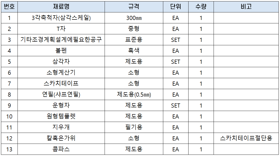 조경산업기사 실기 도면 작업 시험을 위해서는 아래 지참 준비물 목록에 있는 재료를 규격에 맞게 준비해 가야 합니다.