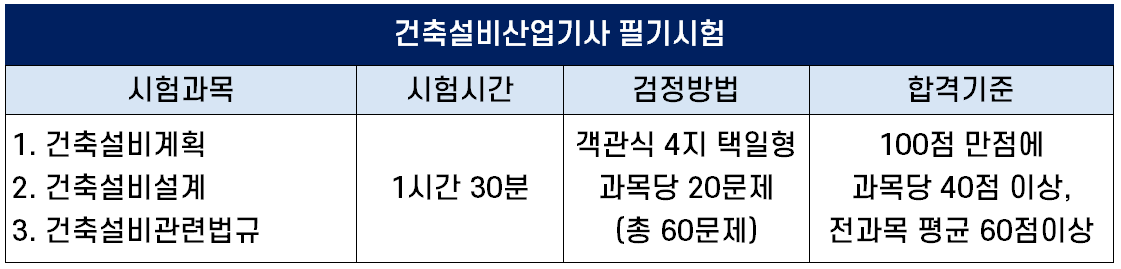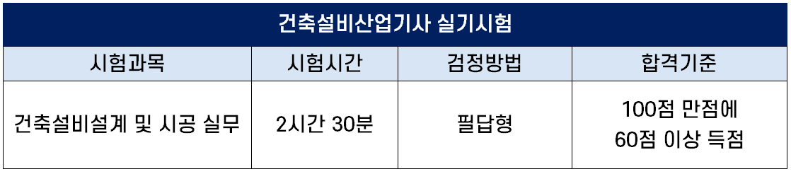실기시험 과목은 건축설비설계 및 시공 실무로 필답형으로 출제되며, 시험시간은 2시간 30분이고, 100점 만점에 60점 이상 득점하면 합격입니다.