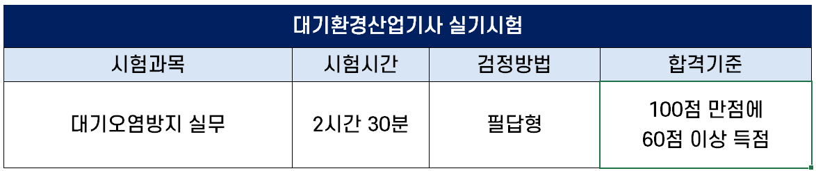 실기시험 과목은 대기오염방지 실무로 필답형으로 출제되며, 시험시간은 2시간 30분이고, 100점 만점에 60점 이상 득점하면 합격입니다.