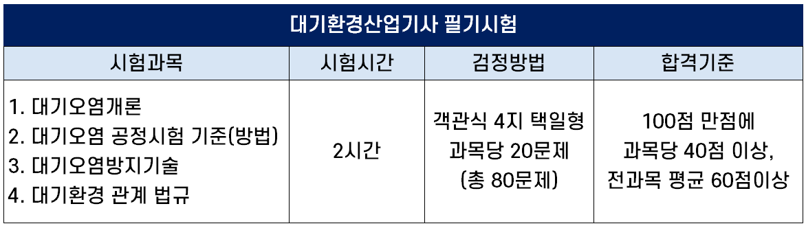 대기환경산업기사 필기시험과목은 ① 대기오염개론, ② 대기오염 공정시험 기준(방법), ③ 대기오염 방지기술, ④ 대기환경관계법규(대기환경 보전법, 환경정책기본법, 악취방지법, 실내공기질 관리법 등 포함)의 4과목으로 구성됩니다. 과목별 세부 출제기준은 하단에 첨부한 대기환경산업기사 출제기준 파일을 보시기 바랍니다.