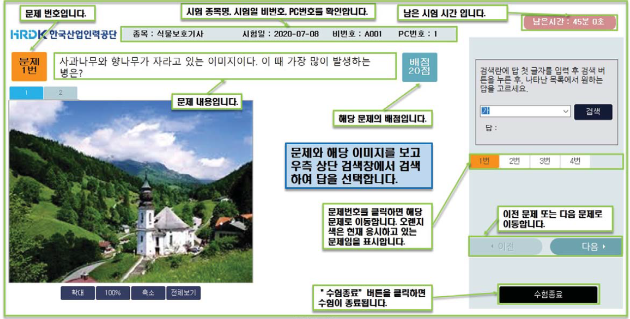 식물보호산업기사 필기시험은 응시자가 컴퓨터 화면으로 시험문제를 읽고 마우스로 정답을 클릭하는 CBT (Computer Based Test) 방식으로 시행되기 때문에 시험을 완료하는 즉시 득점과 합격여부를 확인할 수 있습니다.