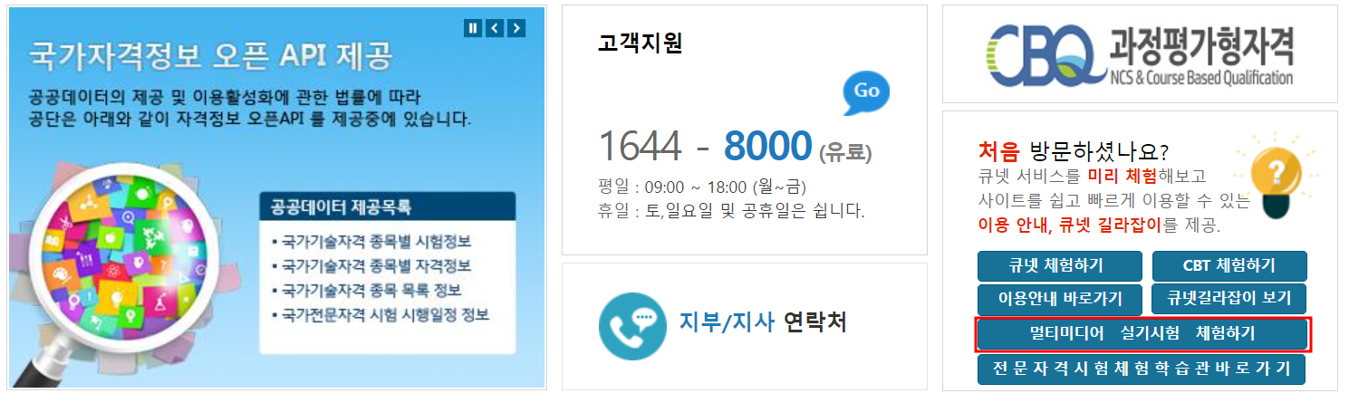 큐넷 홈페이지 우측하단에 위치한 '멀티미디어 실기시험 체험하기'를 통해 미리 시험 환경을 체험해볼 수 있습니다.