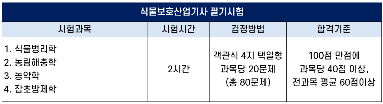 식물보호산업기사 필기시험과목은 ① 식물병리학, ② 농림해충학, ③ 농약학, ④ 잡초방제학의 4과목으로 구성됩니다.