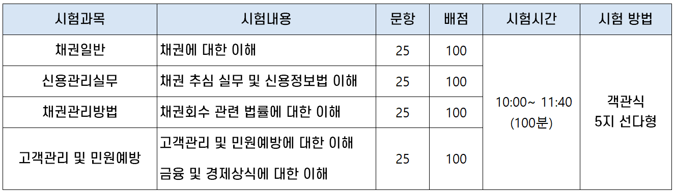 신용관리사 시험과목은 ① 채권 일반, ② 신용관리실무, ③ 채권관리방법, ④ 고객관리 및 민원예방의 4과목인데요. 각 과목마다 객관식 5지 선다형 25문제가 출제되어 총 100문제를 100분(10:00~11:40) 동안 풀게 됩니다.