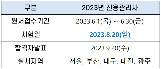2023년 신용관리사 시험 일정은 다음과 같고, 시험일은 2023년 8월 20일입니다.