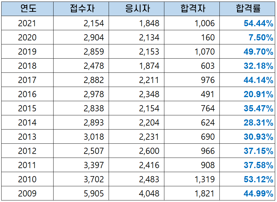2021년에는 54.44%의 합격률을 보여 평균 합격률보다 높은 합격률을 기록했습니다.