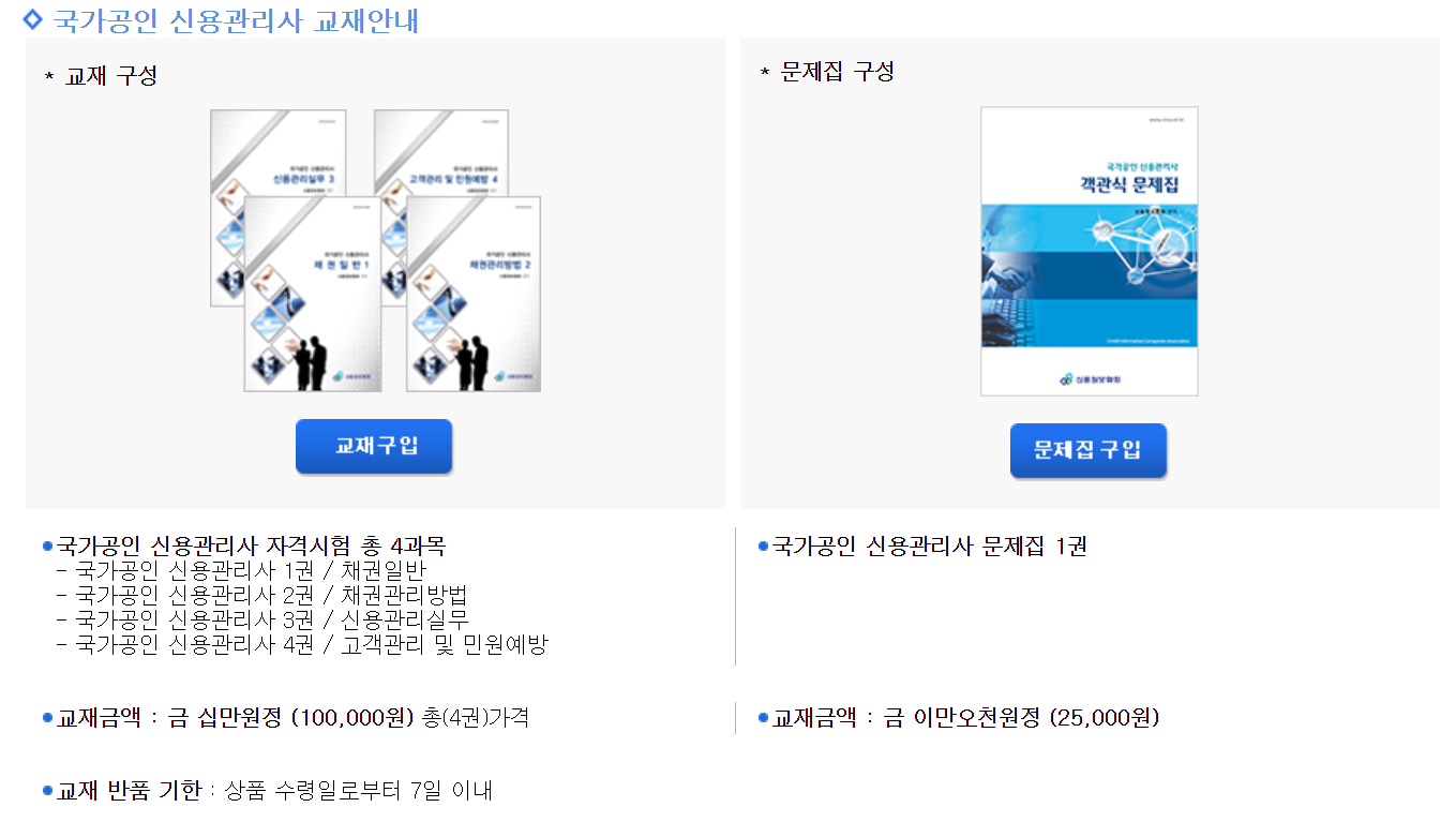 신용관리사 자격시험 교재와 문제집은 시험을 시행하는 신용정보협회 홈페이지에서 구매할 수 있습니다.