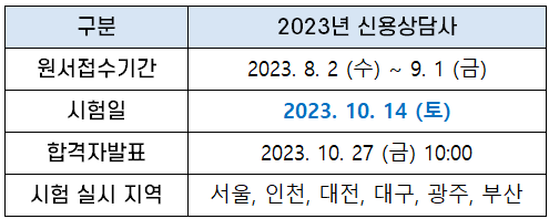 신용상담사 시험은 매년 1회 시험이 시행되고 있는데요. 2023년 신용상담사 시험 일정은 다음과 같습니다.