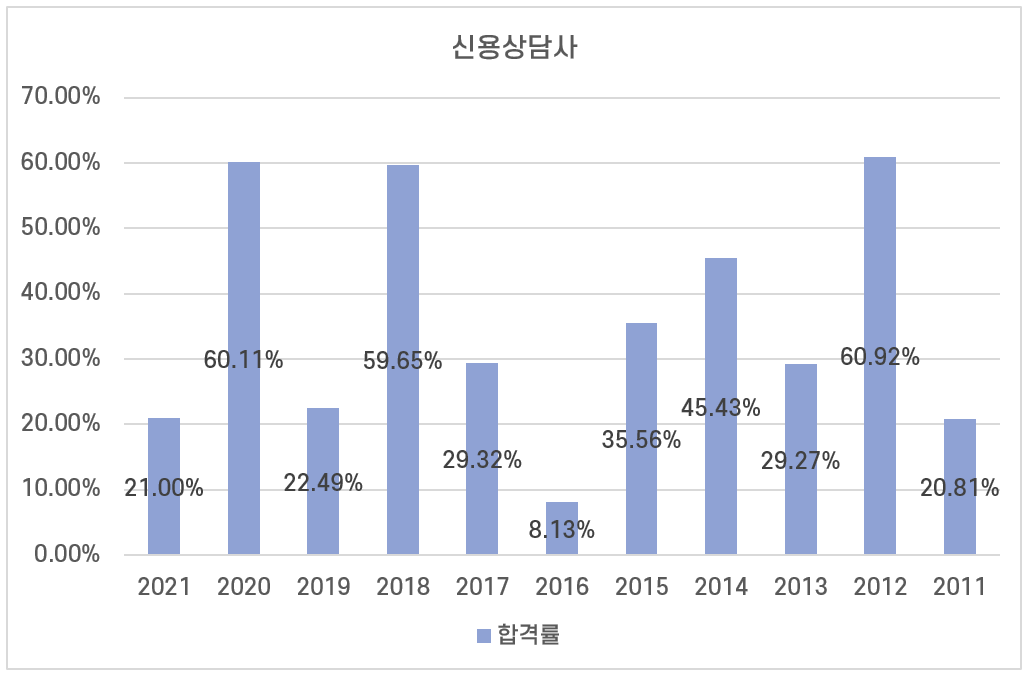 신용상담사의 연도별 합격률은 편차가 큰 편인데요. 2016년에 8.13%의 낮은 합격률을 보이기도 했고, 2012년에 60.92%의 높은 합격률을 기록하기도 했습니다.