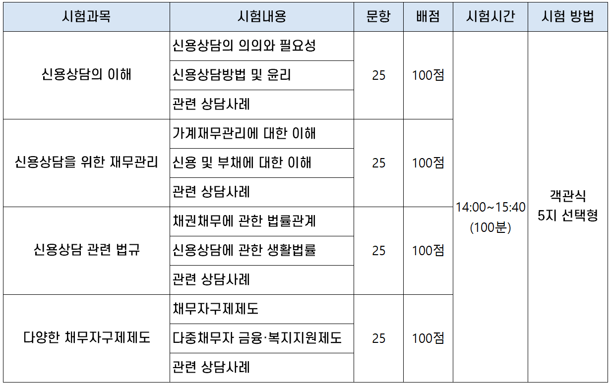 신용상담사 시험과목은 ① 신용상담의 이해, ② 신용상담을 위한 재무관리, ③ 신용상담 관련 법규, ④ 다양한 채무자구제제도의 4과목인데요. 각 과목마다 객관식 5지 선다형 25문제가 출제되어 총 100문제를 100분(14:00~15:40) 동안 풀게 됩니다.