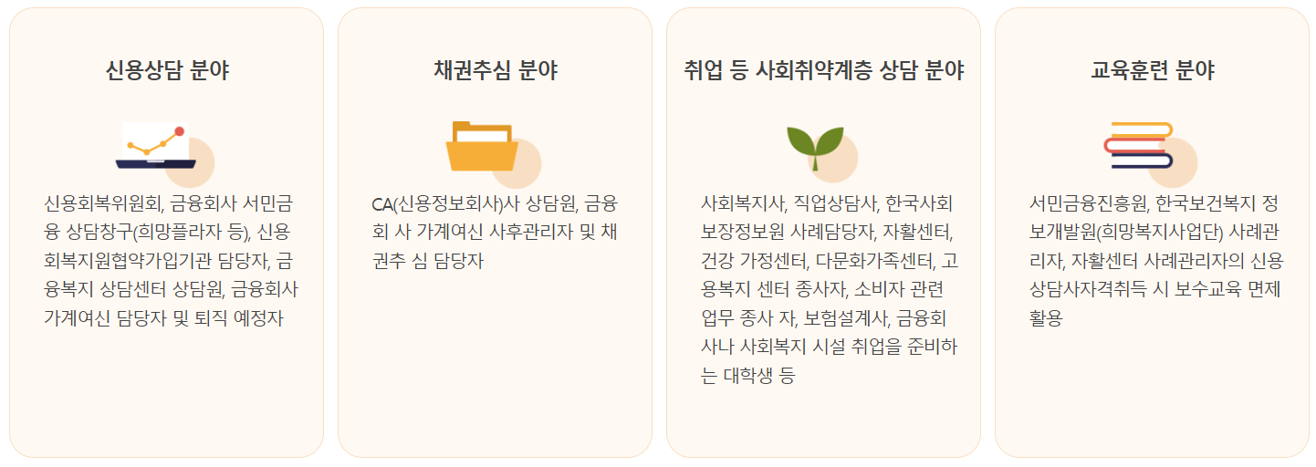 신용상담사 자격증을 취득하면 신용회복위원회 입사 전형시 우대를 받으며, 금융회사 서민 금융 상담 창구나 신용정보회사 상담원, 지자체 금융복지 상담사 취업시 도움이 됩니다.