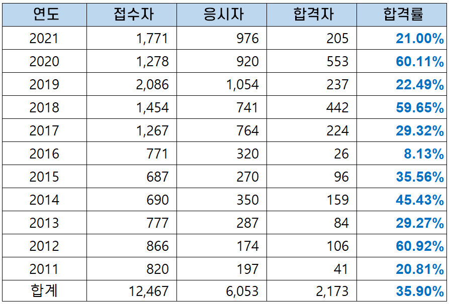 | 연도 | 응시자 | 합격자 | 합격률 |