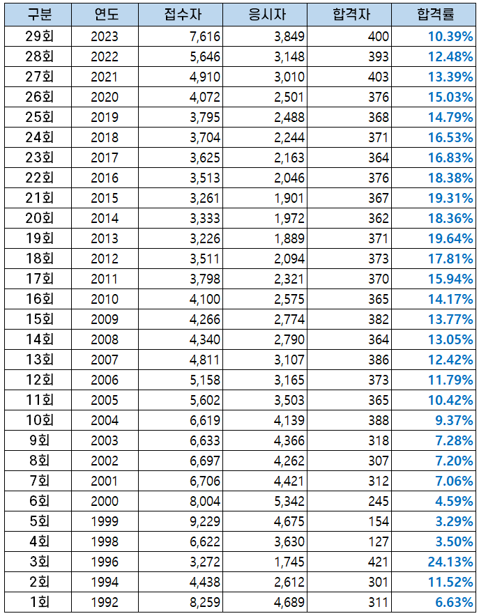 | 구분 | 연도 | 응시자 | 합격자 | 합격률 |
