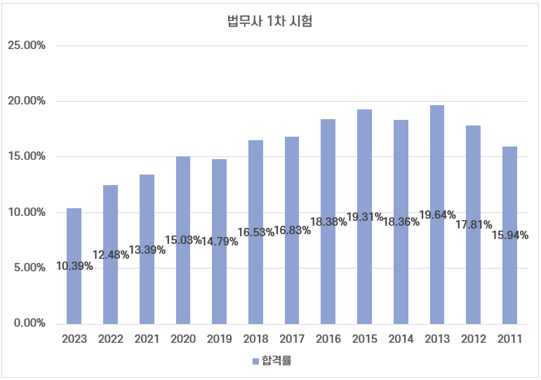 역대 법무사 1차 시험 평균 합격률은 10.31%인데요. 시험 난이도와 응시인원에 따라 3~25% 사이의 합격률 분포를 보이고 있습니다.