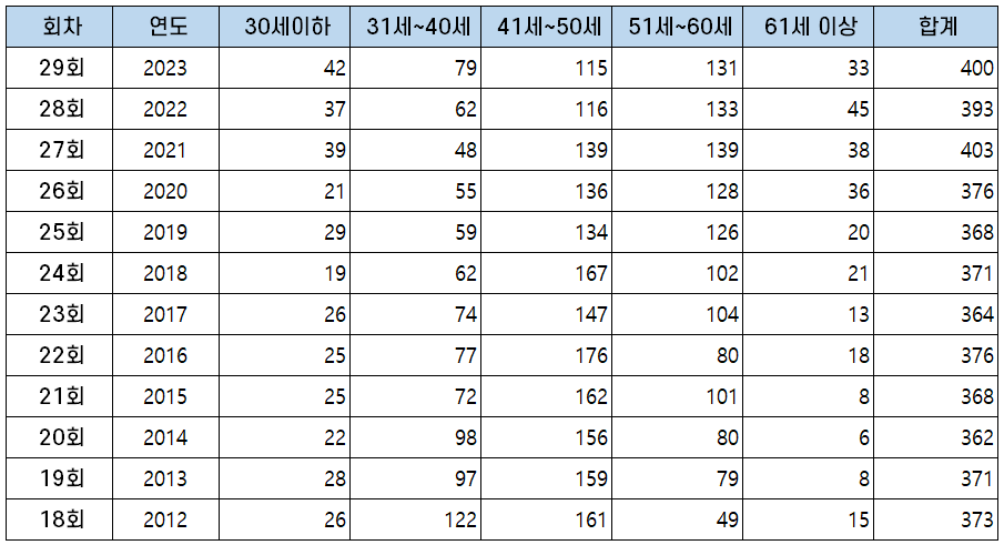 | 29회 | 2023 | 19세 | 70세 |