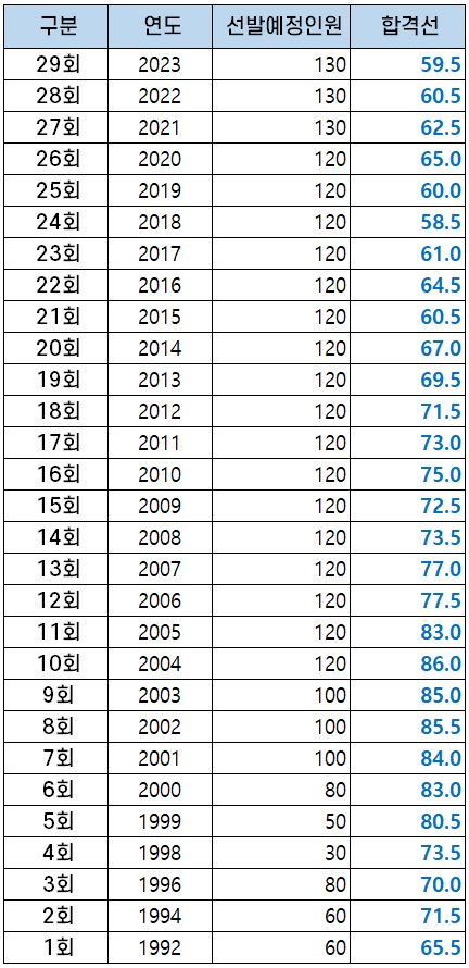 1992년 제1회부터 2023년 제29회까지 법무사 1차 시험 합격선(커트라인)은 아래 표와 같습니다.