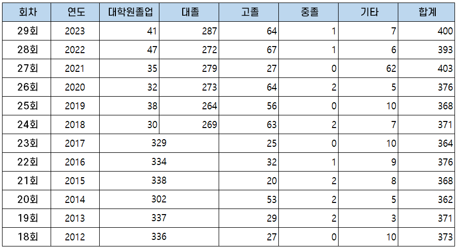 | 27회 | 2021 | 3,010 | 403 | 13.39% |