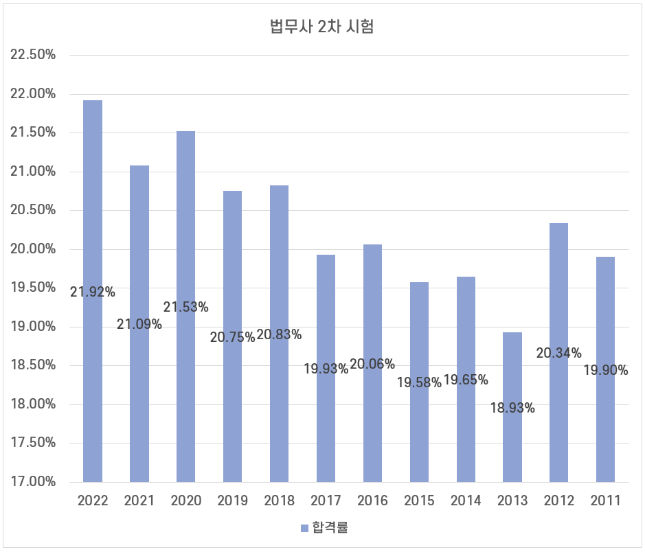 2022년 제28회 법무사 2차 시험까지 평균 합격률은 19.96%입니다.