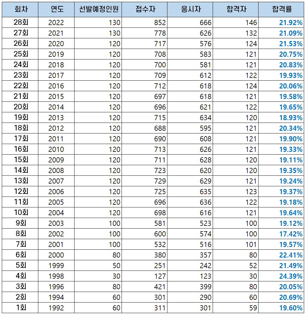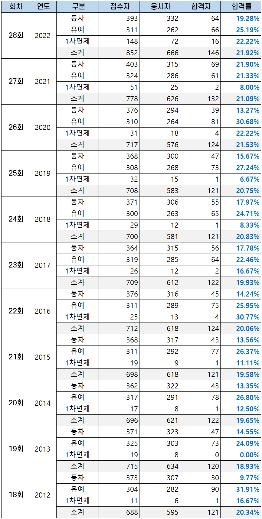 | 회차 | 연도 | 응시자 | 합격자 | 합격률 |