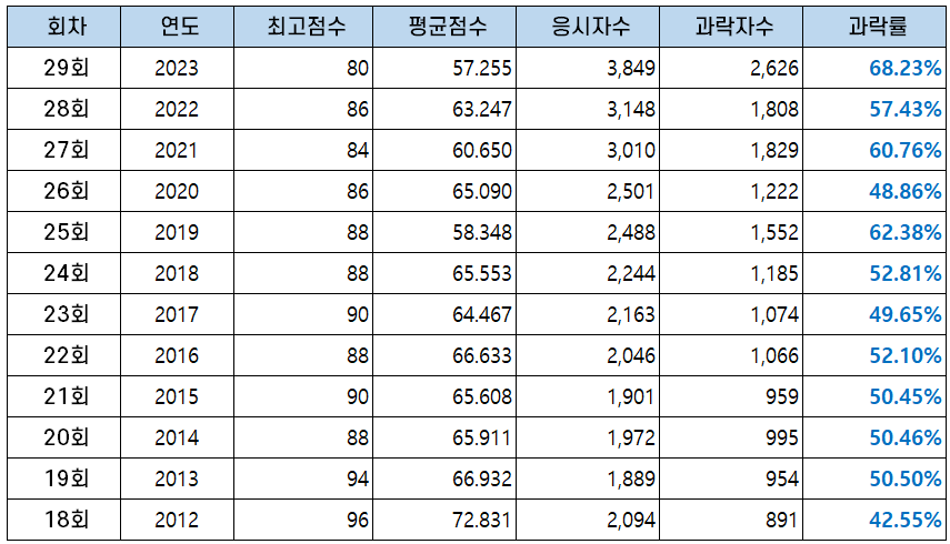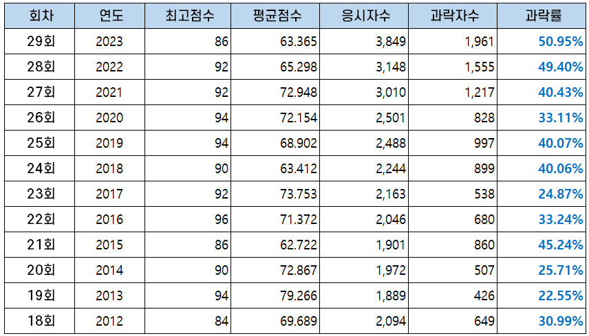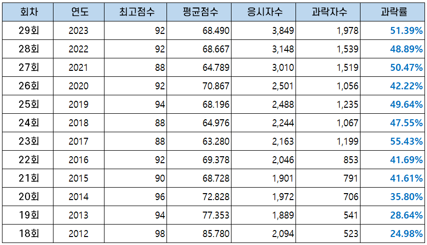 | 회차 | 연도 | 최고점수 | 평균점수 | 과락률 |
