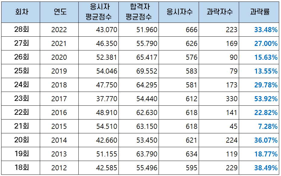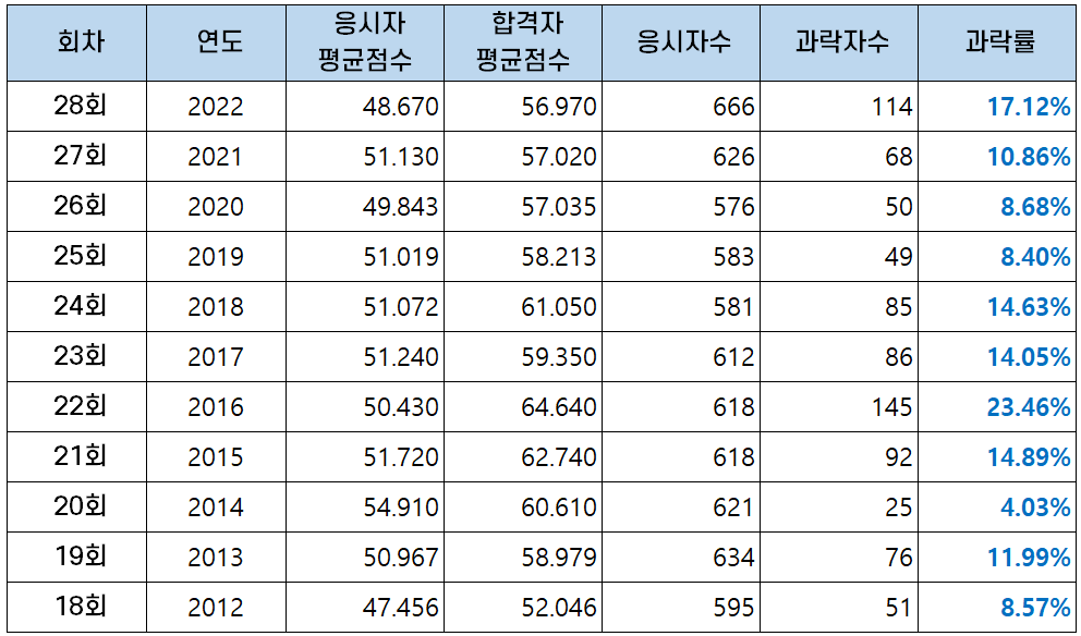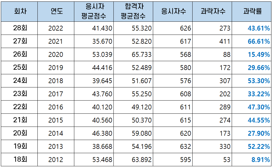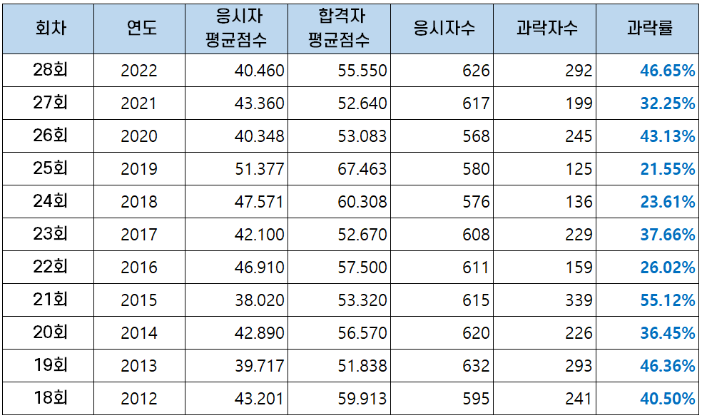 2012년 제18회 시험에서 8.91%의 낮은 과락률을 기록하며 쉽게 출제된 이래 시험 난이도가 올라가면서 과락률이 상승했는데요.