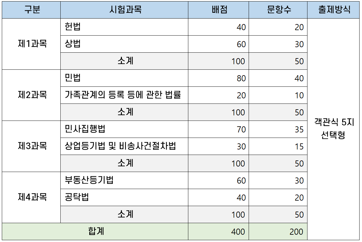 제1시험과목은 헌법과 상법으로 구성되고, 제2과목은 민법과 가족관계의 등록 등에 관한 법률로, 제3과목은 민사집행법과 상업등기법 및 비송사건절차법, 제4과목은 부동산등기법과 공탁법으로 구성되며, 각 시험 과목별로 배점과 출제 문항수는 아래 표와 같습니다.
