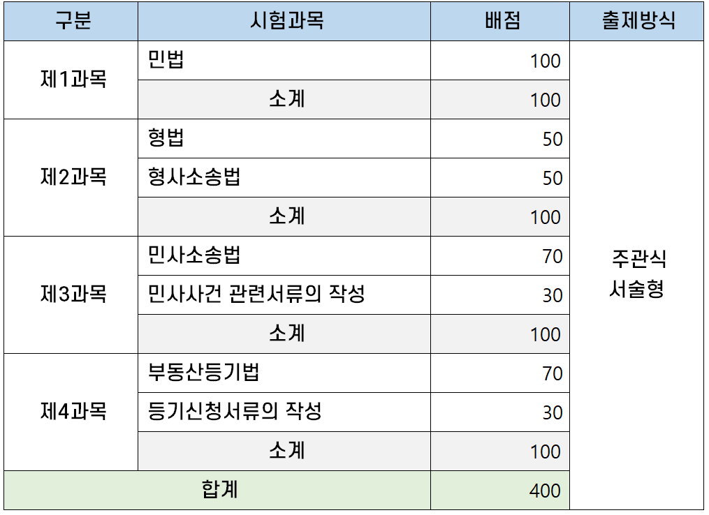 제1시험과목은 민법이고, 제2과목은 형법과 형사소송법으로, 제3과목은 민사소송법과 민사사건 관련 서류의 작성으로, 제4과목은 부동산등기법과 등기신청서류의 작성으로 구성되며, 각 시험 과목별 배점은 아래 표와 같습니다.