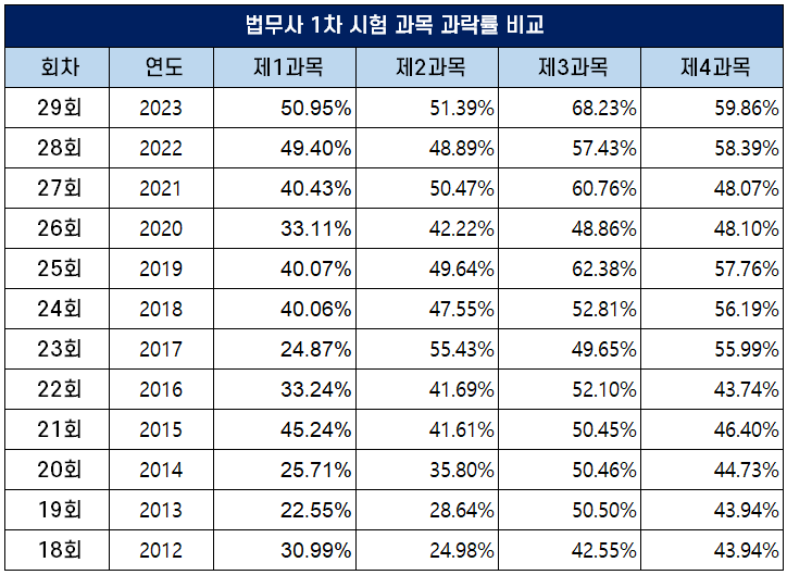 2023년 제29회 시험에서는 과락률이 50.95%로 최근 시행된 시험 중에서 가장 높아 어렵게 출제되었음을 알 수 있는데요. 2명 중의 1명이 1과목인 헌법과 상법에서 40점을 득점하지 못해 과락으로 불합격했습니다.