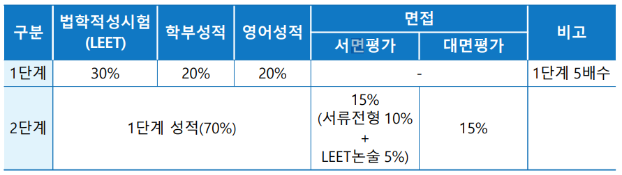 1단계 서류 전형은 법학적성시험(LEET) 성적 30점, 학부 성적 20점, 영어 성적 20점으로, 합계 70점 만점 기준으로 평가합니다.