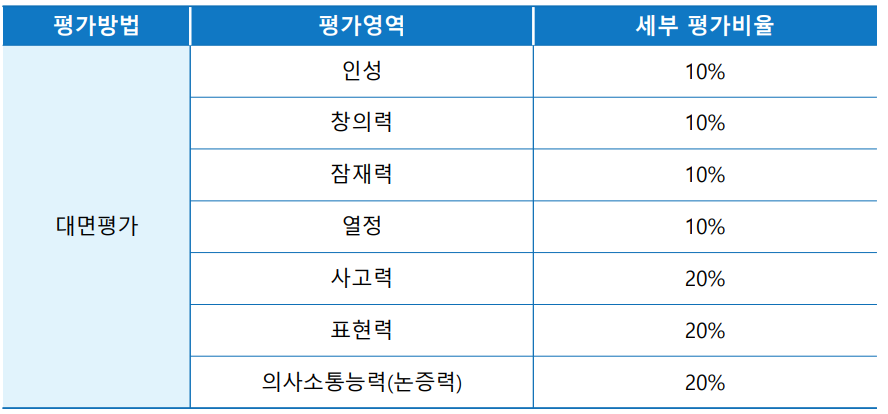 대면평가는 아래 평가영역과 평가비율에 따라 평가하는데요. 면접조의 편성에 따라 지원자들의 점수가 편중되는 것을 방지하기 위해 모든 전형에 대하여 표준점수제를 시행하고, 면접 시행 시 법학지식은 묻지 않습니다.