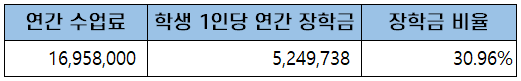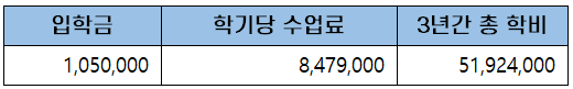 첫 학기 등록금은 입학금과 학기당 수업료를 합한 9백 5십 2만 9천 원이고, 이후 5학기 동안 등록금은 학기당 수업료를 내게 되어 3년간 총학비는 약 5천만 원(51,924,000)입니다.