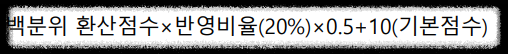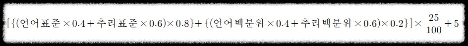 리트 성적은 30점 만점으로 평가하며, 언어이해 영역 점수와 추리논증 영역 점수를 아래의 산출식에 따라 환산합니다.