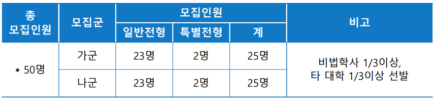 아주대 로스쿨은 가군과 나군에서 각각 25명을 선발해 합계 50명을 모집합니다.