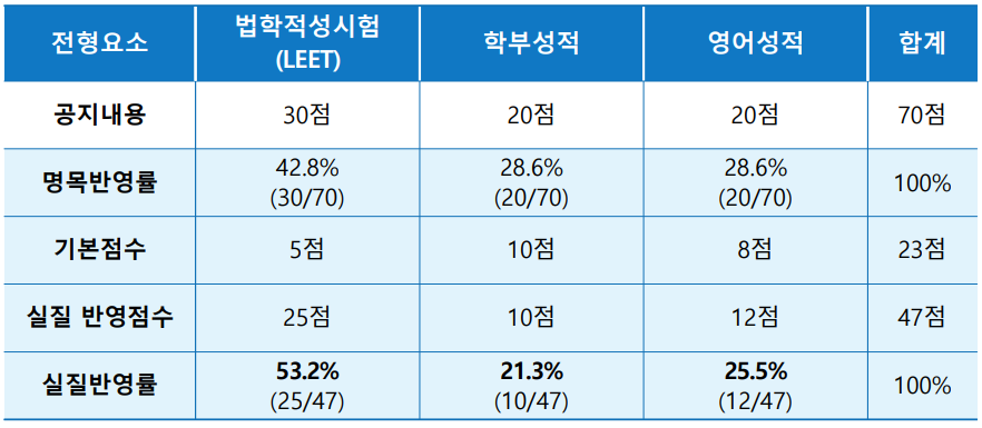 각 요소별로 기본점수가 주어지기 때문에 기본점수를 제외한 1단계 서류 전형 요소의 실질 반영 비율은 아래 표와 같이 리트 성적이 53.2%로 가장 높고 영어 성적이 25.5%, 학부 성적이 21.3%의 비율로 반영됩니다.
