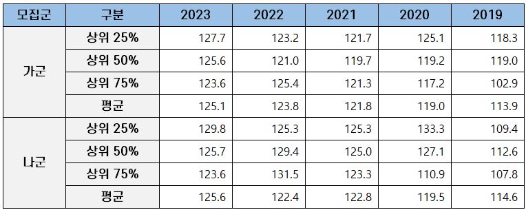 | 가군 | 상위 25% | 127.7 | 123.2 | 121.7 | 125.1 | 118.3 |