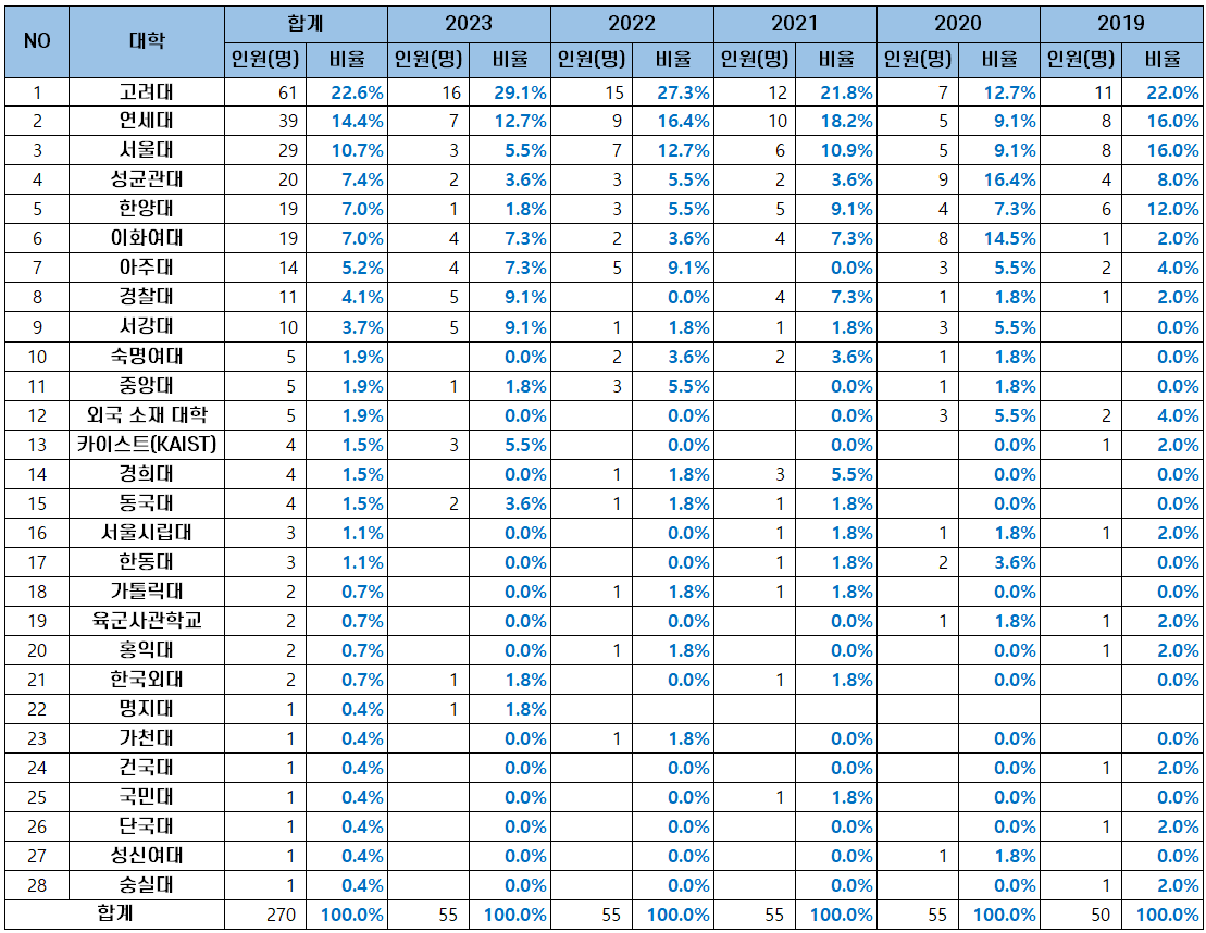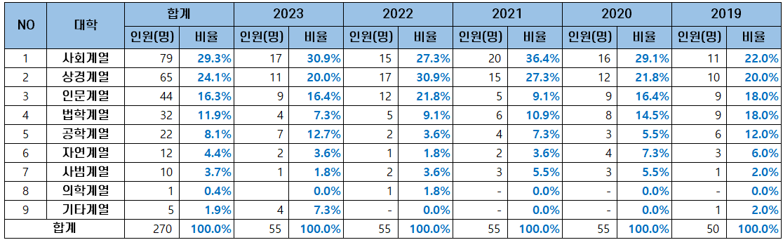 | NO | 대학 | 합계 | 2023 | 2022 | 2021 | 2020 | 2019 |