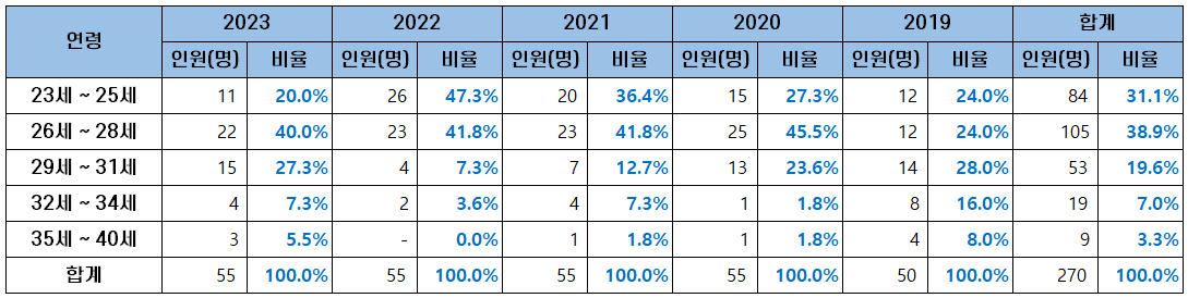 대부분의 합격자가 23세 ~ 28세 사이이며, 최근에는 35세 이상의 합격자가 줄어들면서 2022년과 단 명도 합격하지 못했으나 2023년에는 3명의 합격자가 나왔습니다.
