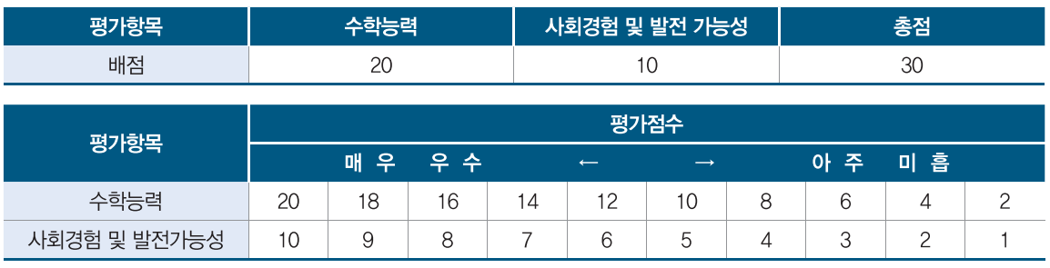 서류평가의 평가항목과 배점은 아래 표와 같습니다.