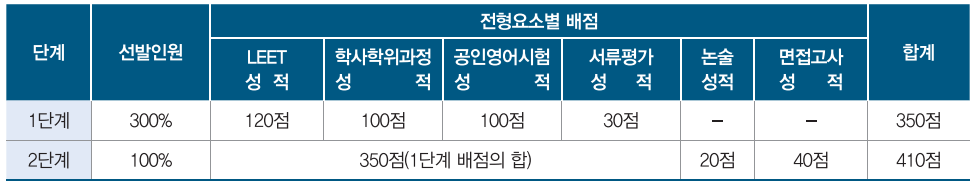 1단계 전형은 법학적성시험(LEET) 성적 120점, 학부 성적 100점, 영어 성적 100점, 서류평가 성적 30점으로, 합계 350점 만점 기준으로 평가합니다.